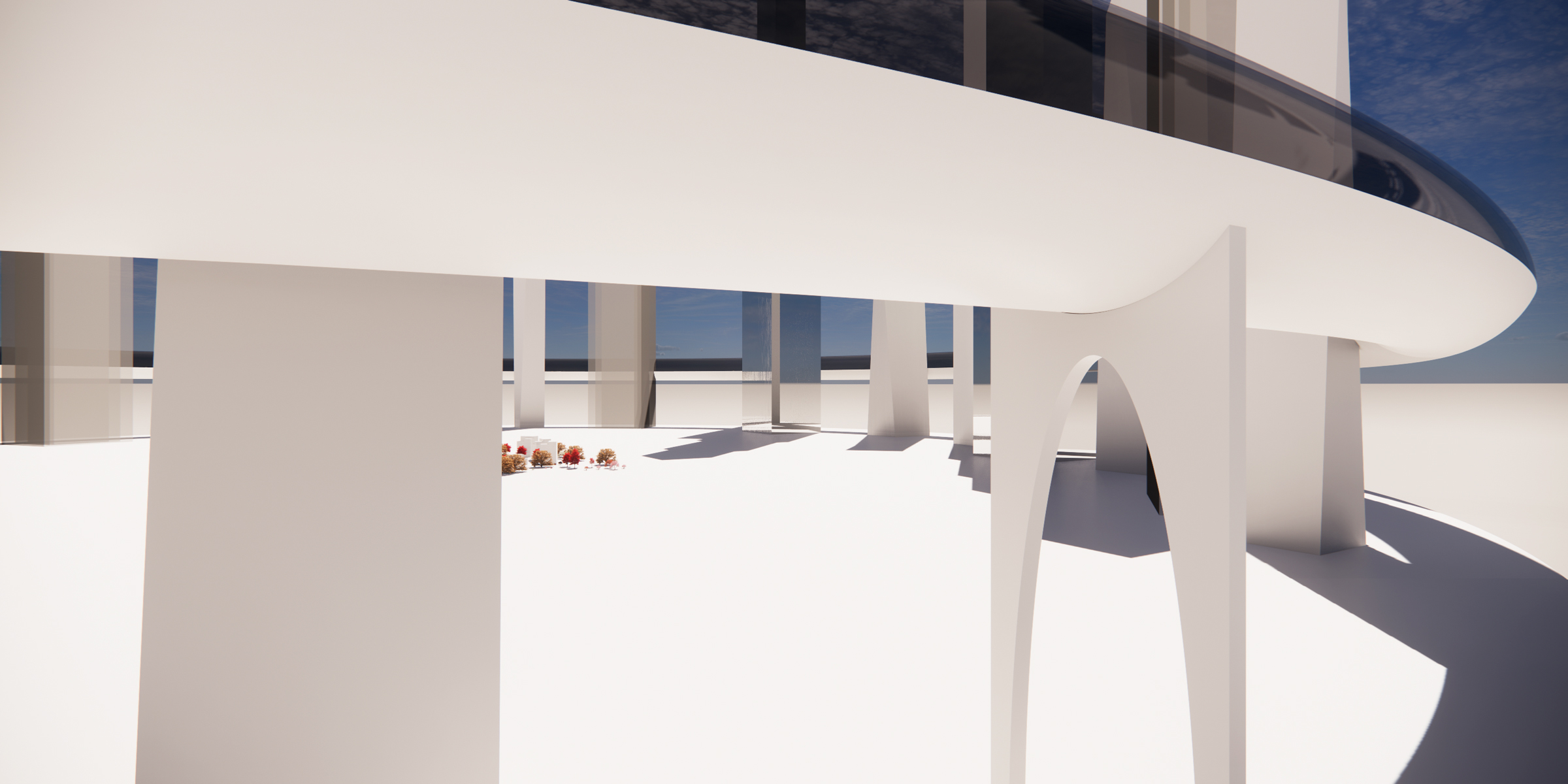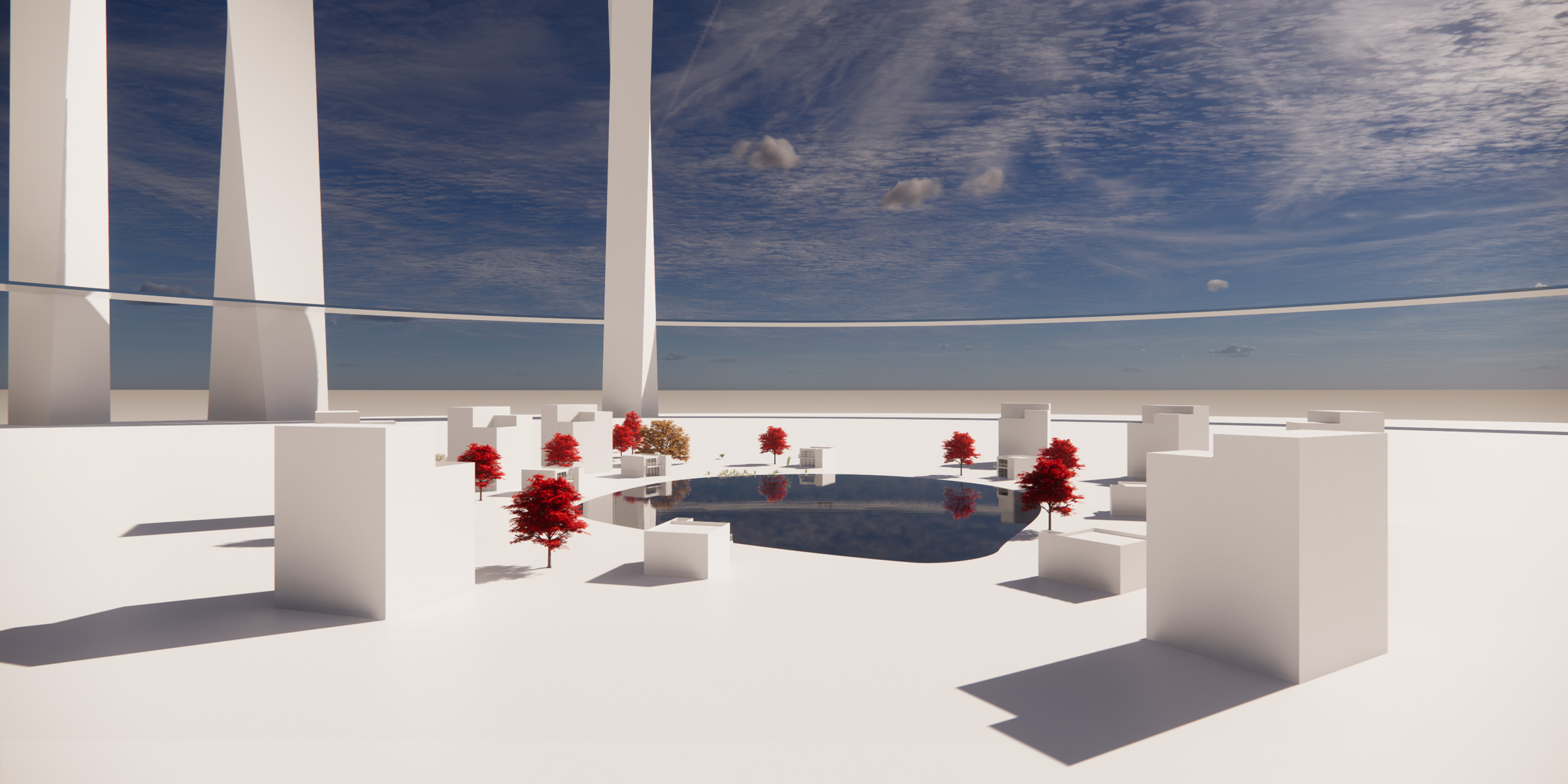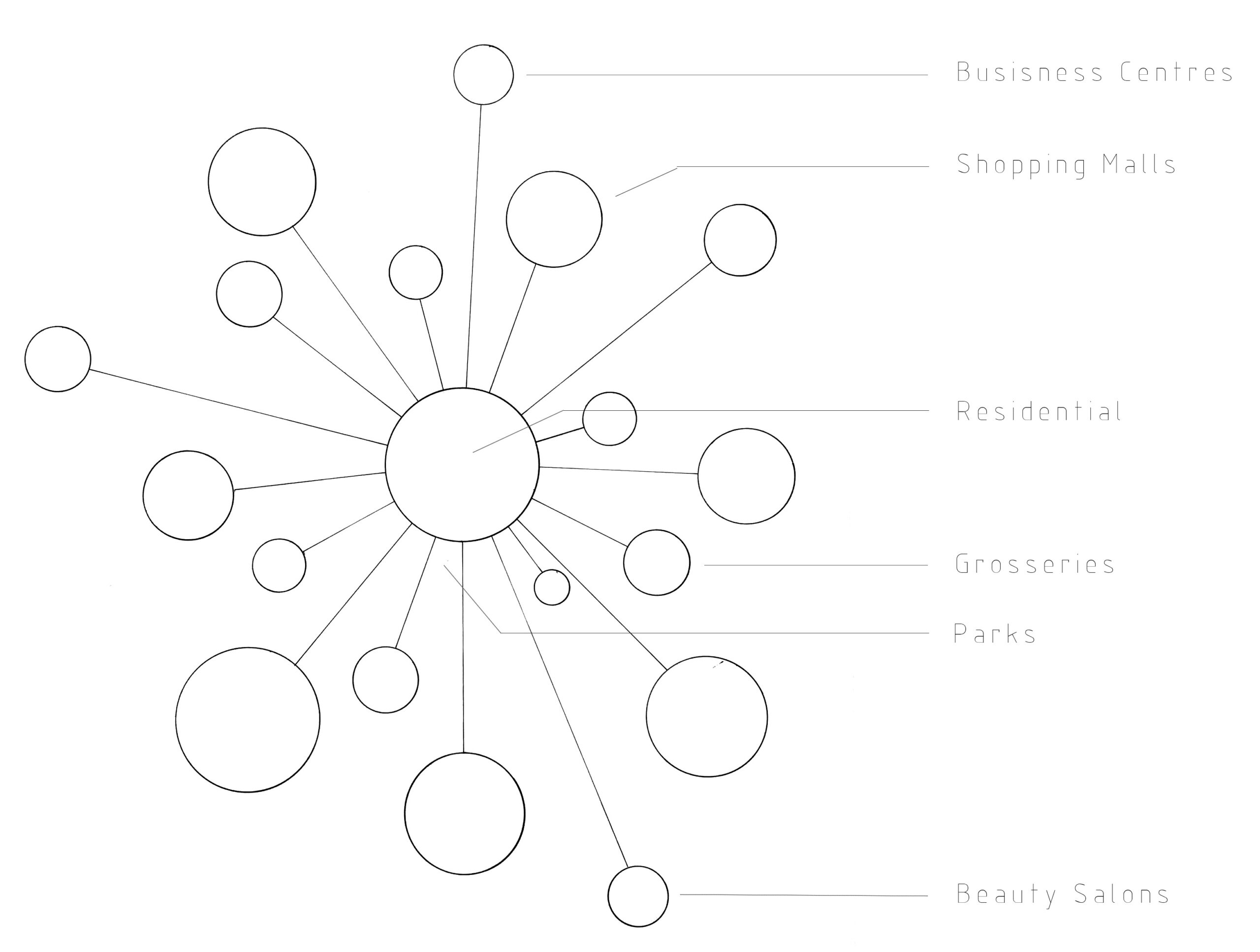 This Diagram shows schematically future planning of the infrastructure. Where Residential Area and the Park in the center (Lake on the drawing), second set of circles are Groceries Stores and Small Businesses (and others, which are necessary in every day life, and third set of circles Skyscrapers are placed.