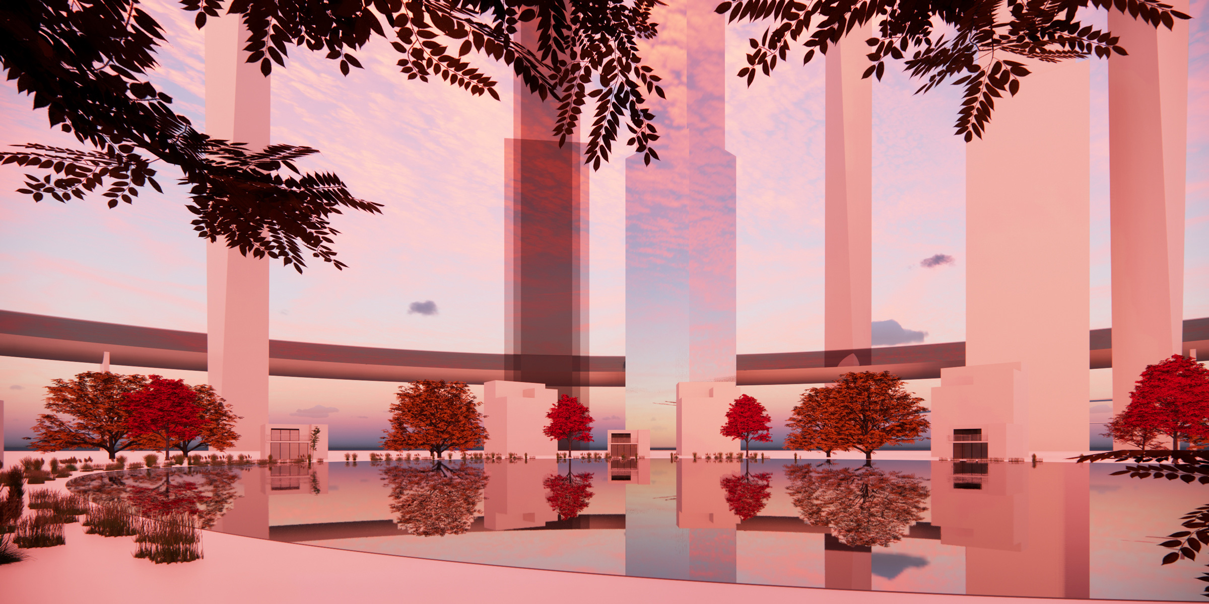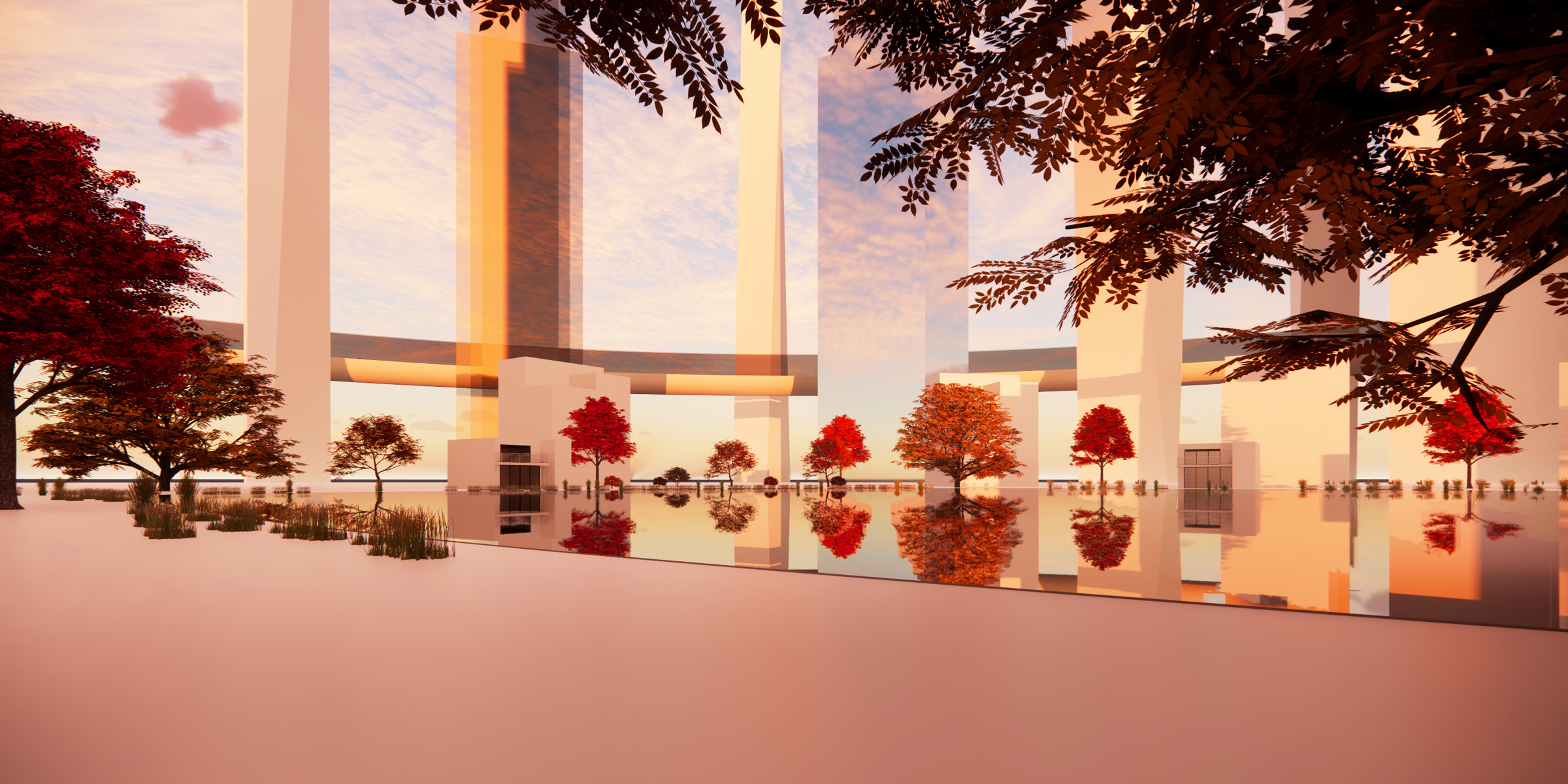 Vegetation grows everywhere and reflects multiple times in the mirrored surface of almost invisible due to that skyscrapers. Imagine