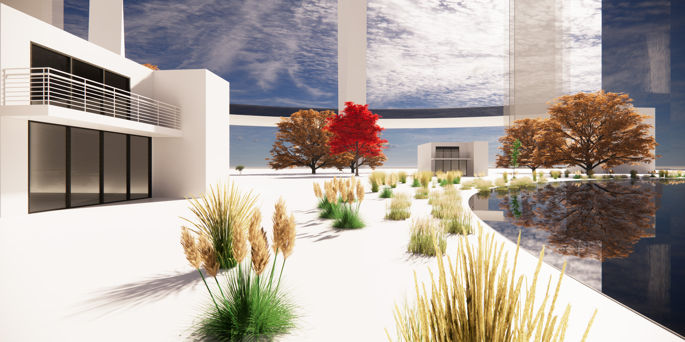 Living sections with the park in the middle with a lots of nature surrounded by skyscrapers building, which serve as a sound barrier from the freeway providing more clean and quiet space.