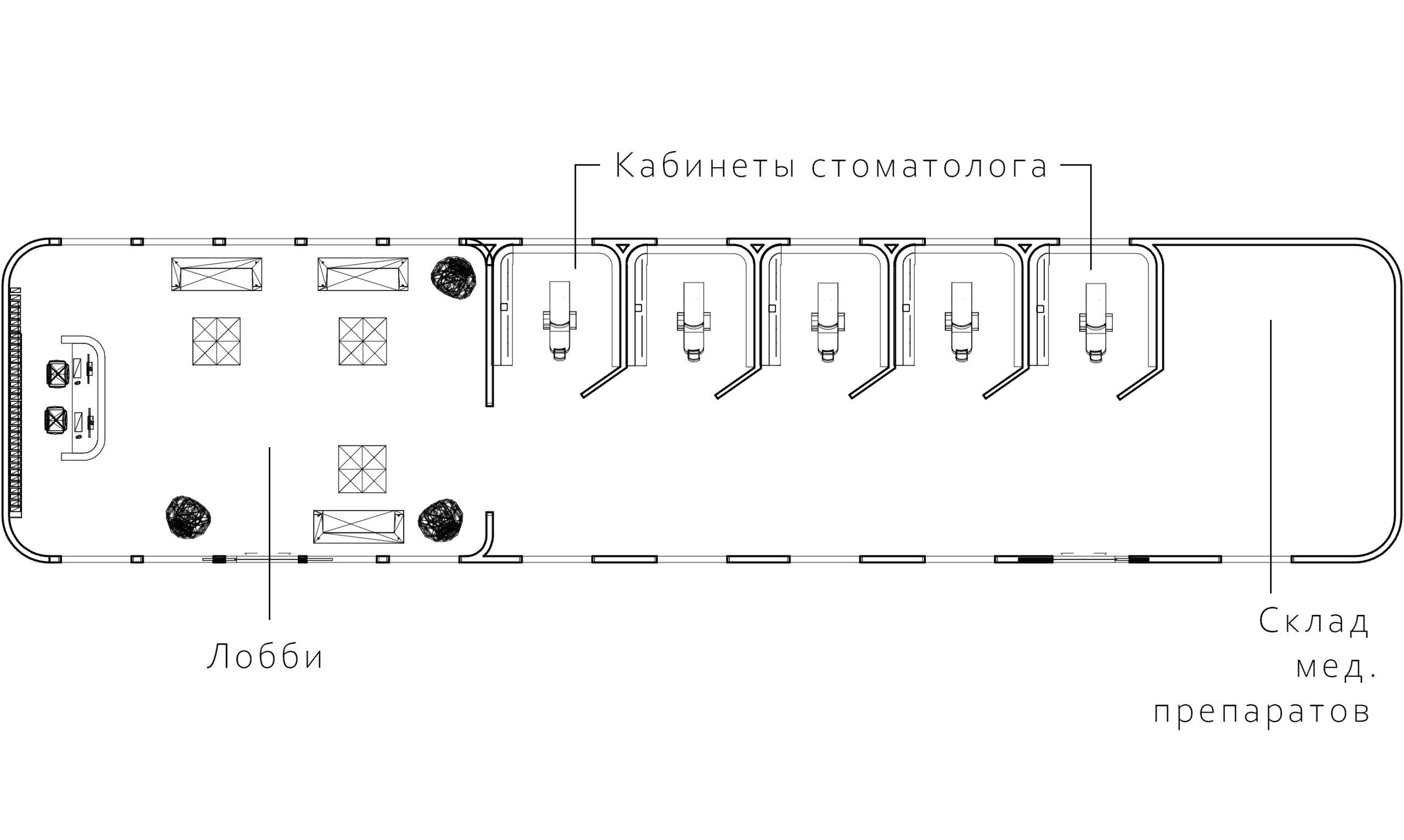 Архитектура здания фасада и нтерьера – чистый и элегантный минимализм, воплощает чистоту и зоровье белого гладкого зуба. Стены, форма окон, крыша перетекают в плавные линии, перекликаясь и повторяя линии зуба. И будто сами стены помогают обрести красивую и здоровую улыбку.